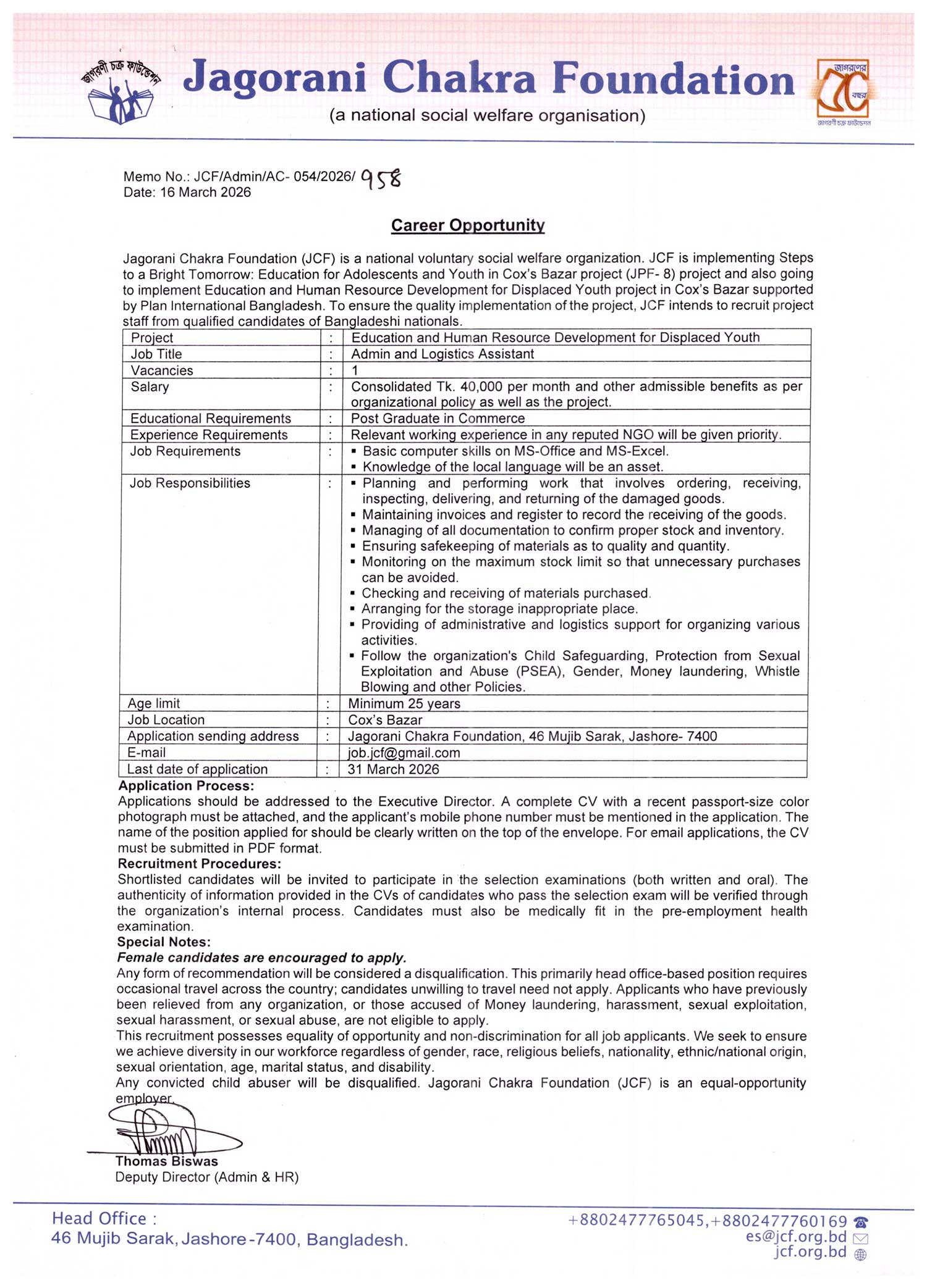 Admin and Logistics Assistant (Education And Human Resource Development for Displaced Youth) Make a Call Tel: +88-02477765045 Mobile Number:+8801770672289 Our Location 46 Mujib Sarak, Jashore-7400, Bangladesh. Send A Message E-mail: es@jcf.org.bd PSEA Hotline Mobile Number: +8801711806978