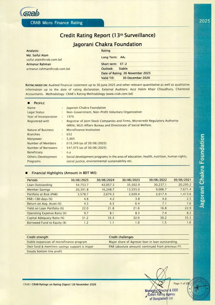 Forbes Magazine rated Jagorani Chakra Foundation as 16th micro finance service providing organisation in the world and 2nd in Bangladesh in 2007……..Read More
