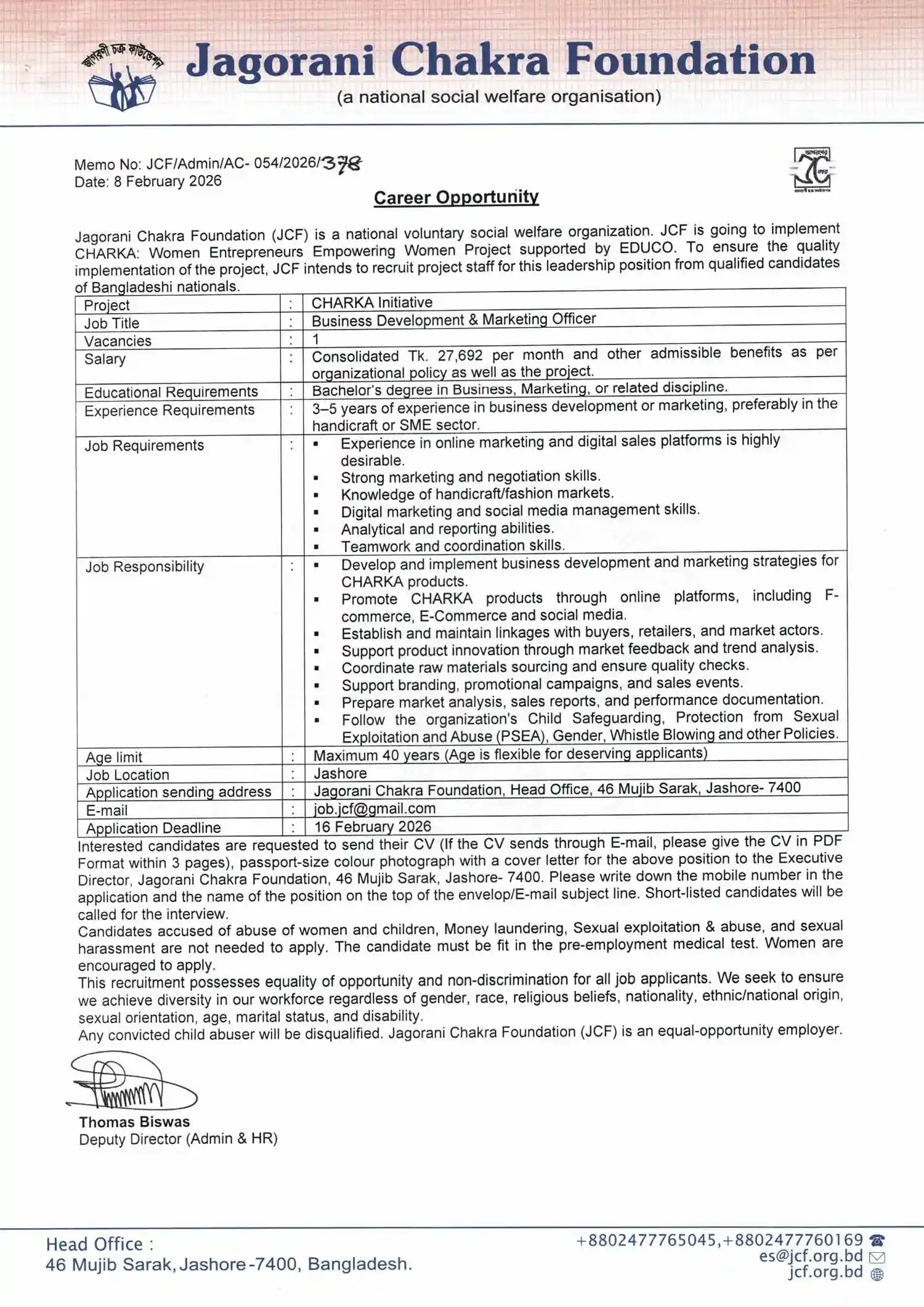 Business Development and Marketing Officer (Charka Initiative) Make a Call Tel: +88-02477765045 Mobile Number:+8801770672289 Our Location 46 Mujib Sarak, Jashore-7400, Bangladesh. Send A Message E-mail: es@jcf.org.bd PSEA Hotline Mobile Number: +8801711806978