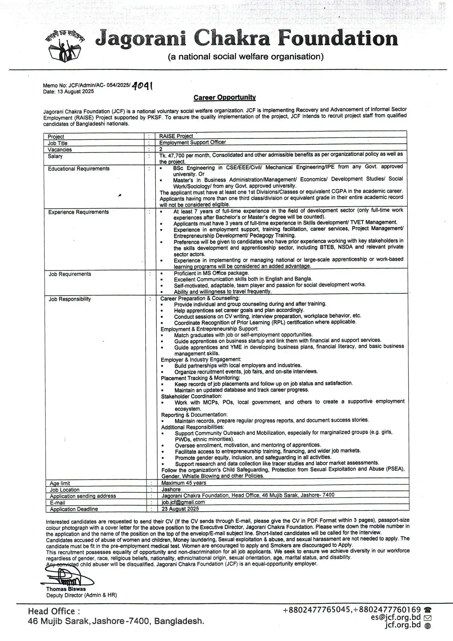 Employment Support Officer (RAISE) Make a Call Tel: +88-02477765045 Mobile Number:+8801770672289 Our Location 46 Mujib Sarak, Jashore-7400, Bangladesh. Send A Message E-mail: es@jcf.org.bd PSEA Hotline Mobile Number: +8801711806978