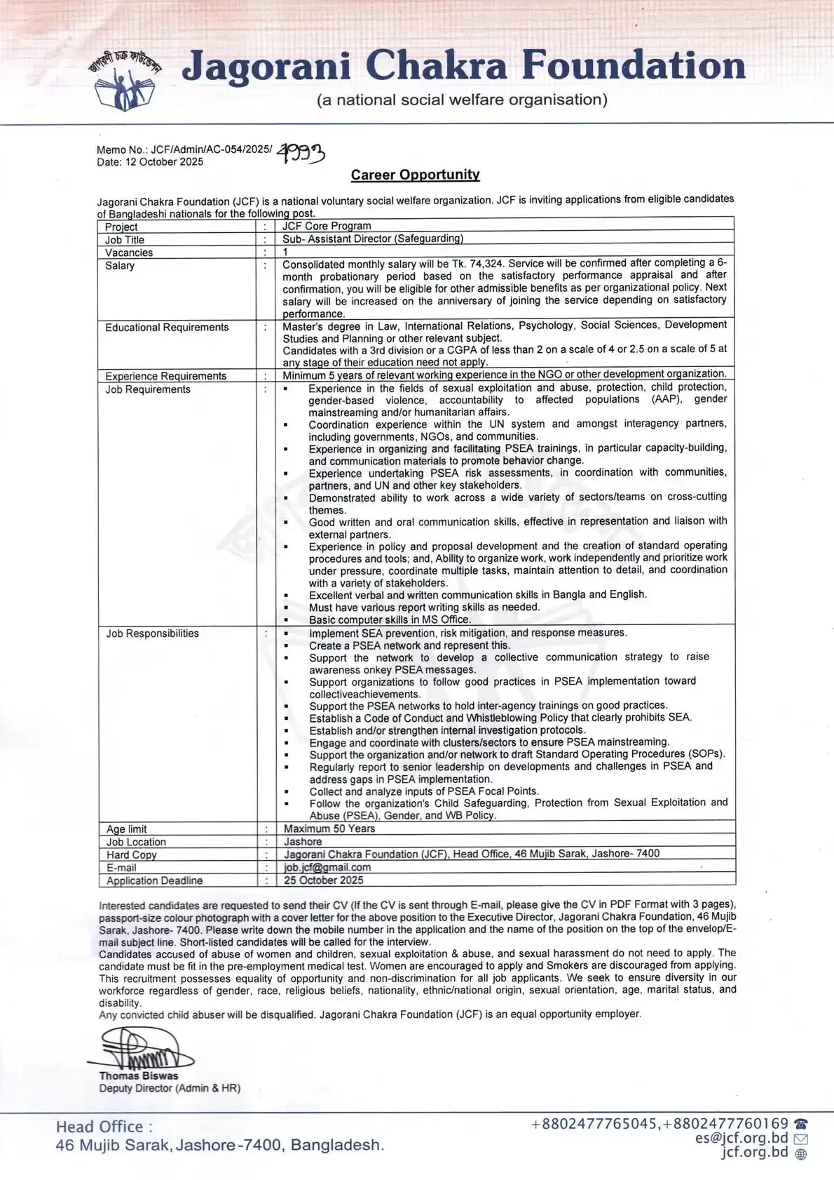 Sub-Assistant Director (Safeguarding)_JCF Core Program Make a Call Tel: +88-02477765045 Mobile Number:+8801770672289 Our Location 46 Mujib Sarak, Jashore-7400, Bangladesh. Send A Message E-mail: es@jcf.org.bd PSEA Hotline Mobile Number: +8801711806978